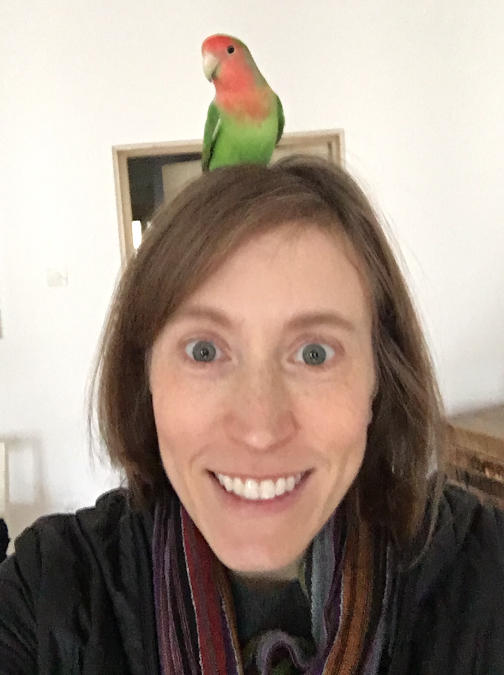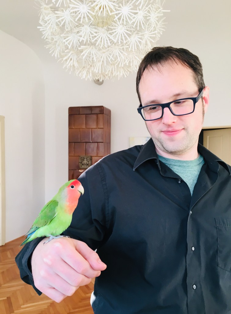 We are staying with a wonderful host here, Anastasiia. She has a sweet birdie named Piki. Here are Garett and I with him. I am actually taking a selfie; Piki waited very patiently on my head while I got out the camera, tried to stabilize my hands, etc.