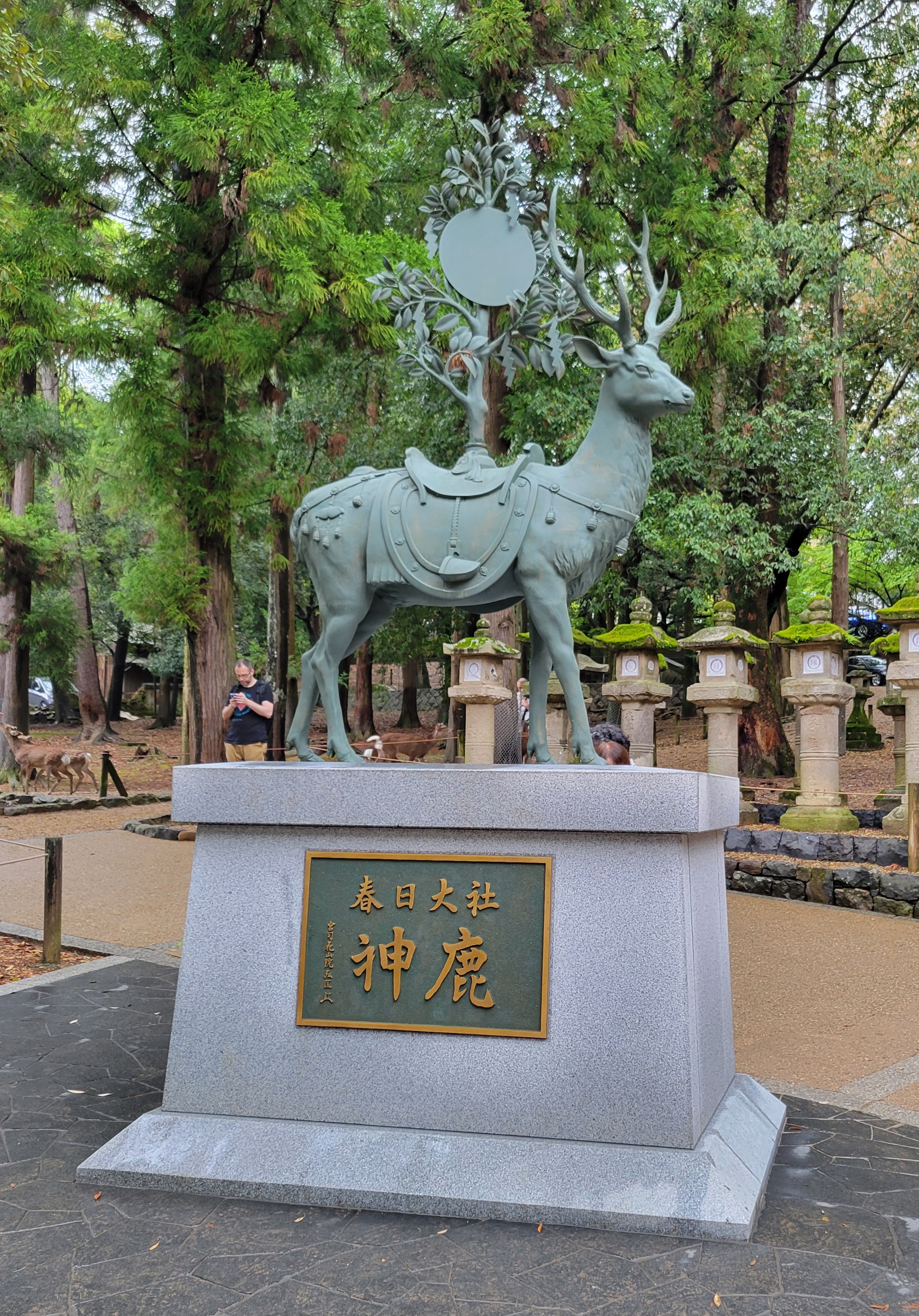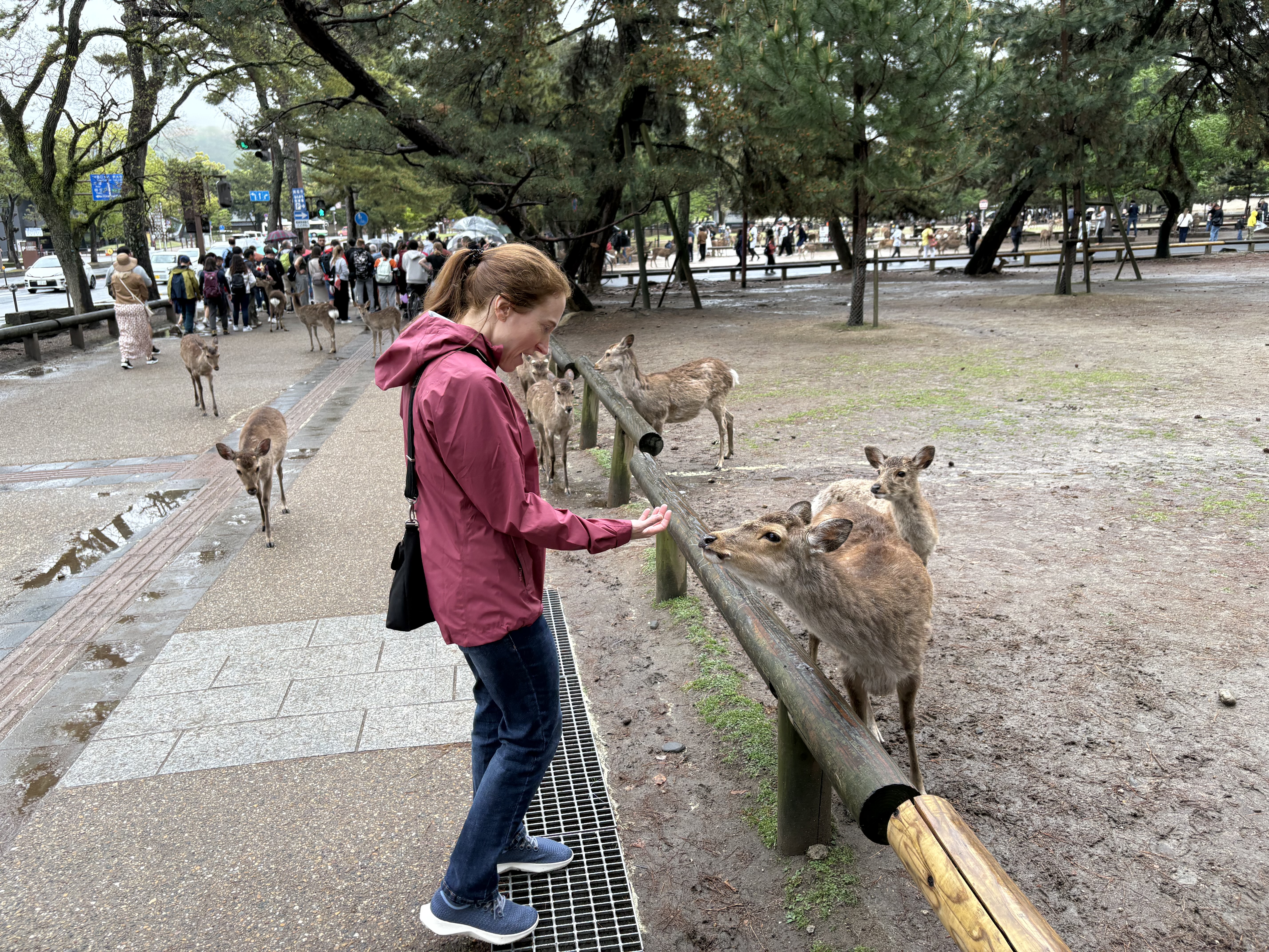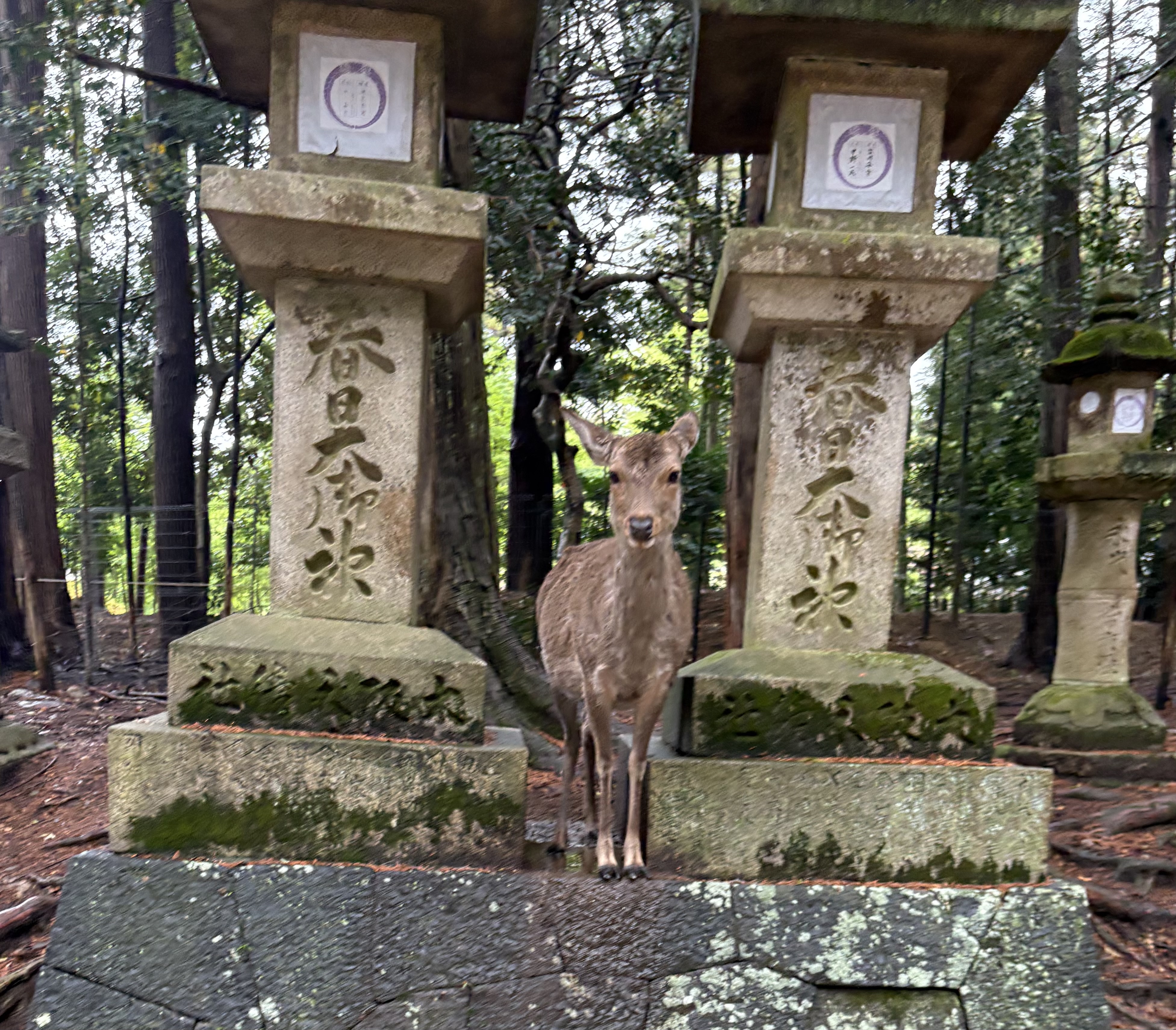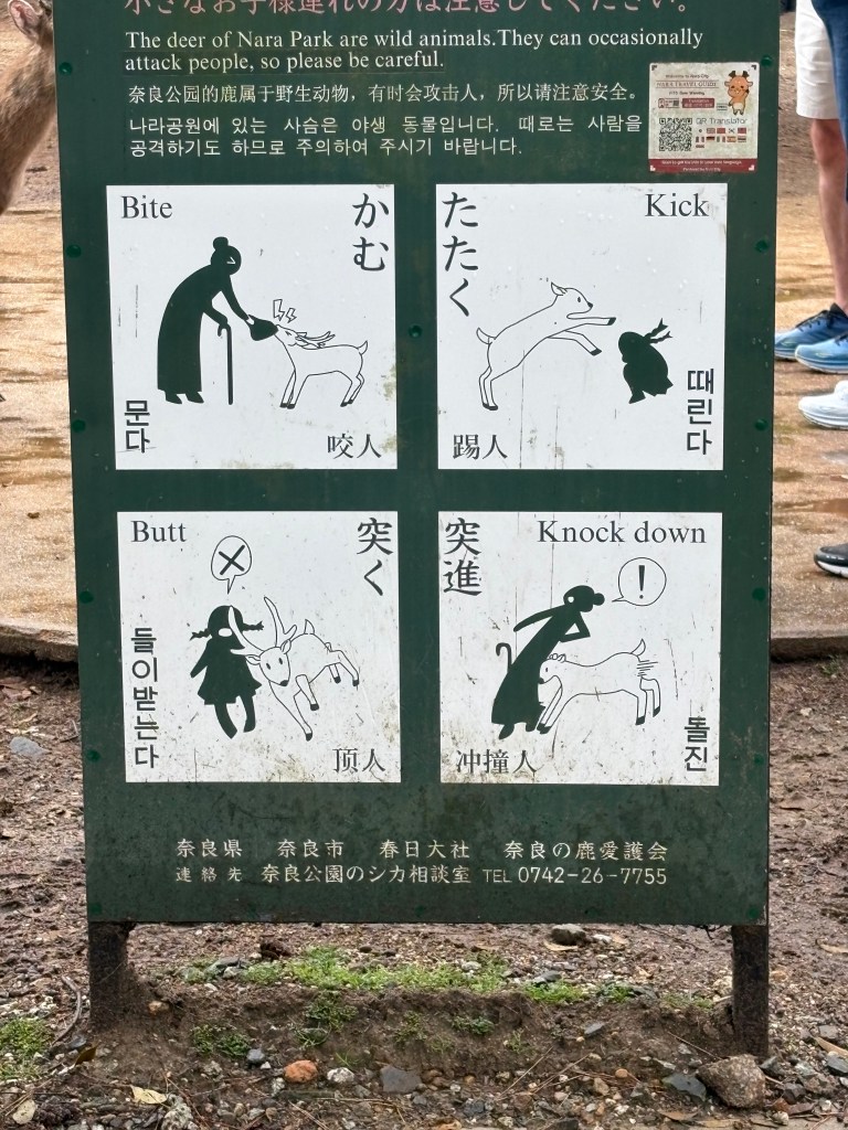 Leaving the temple, Nara deer were all over the place. They walk right up to people, since tourists have been feeding them “deer crackers” for generations, sold in stalls throughout the park. The deer are so comfortable around humans that there are warning signs posted to remind visitors to be cautious.