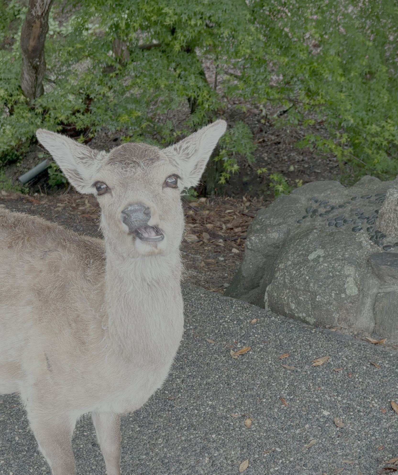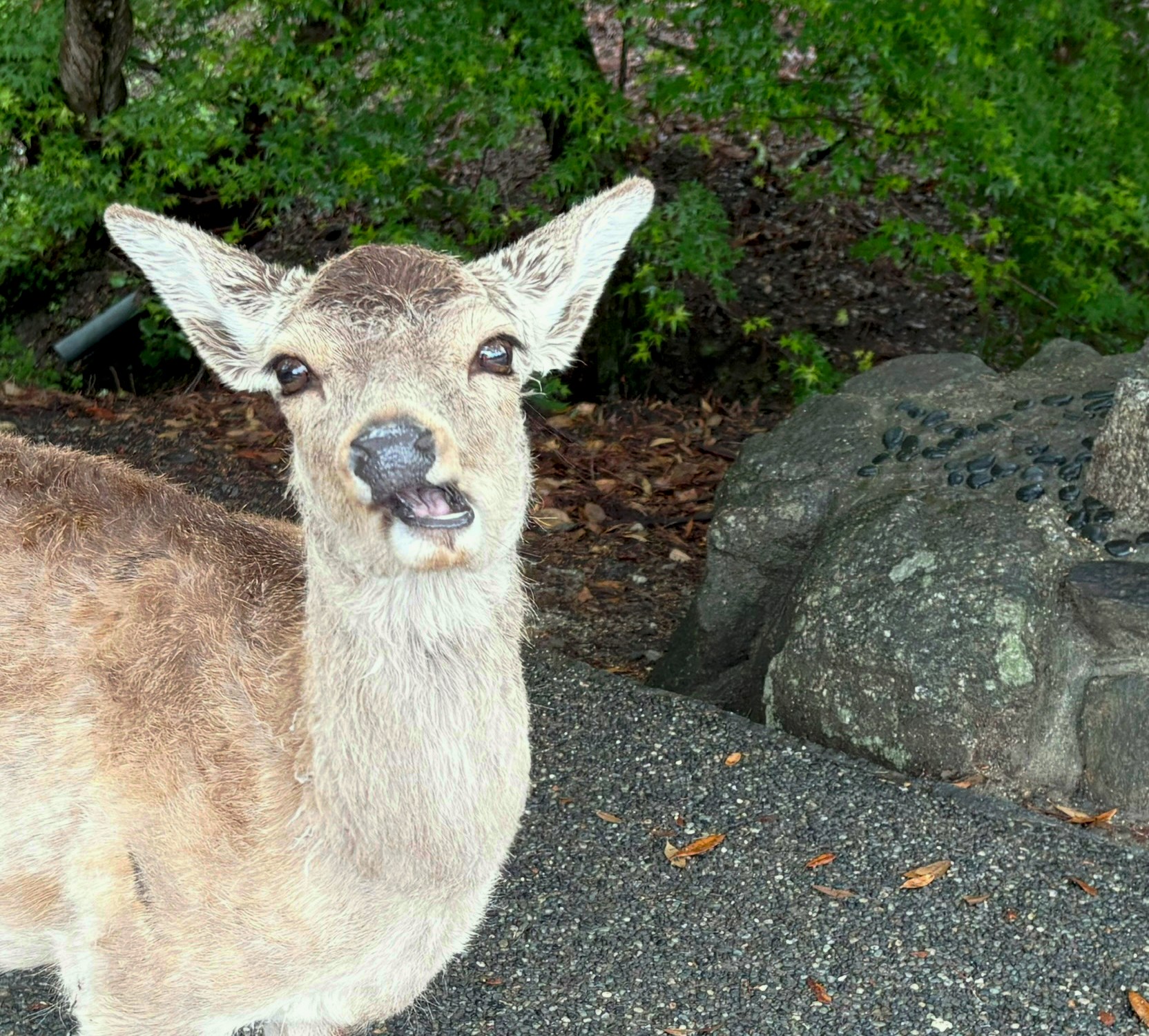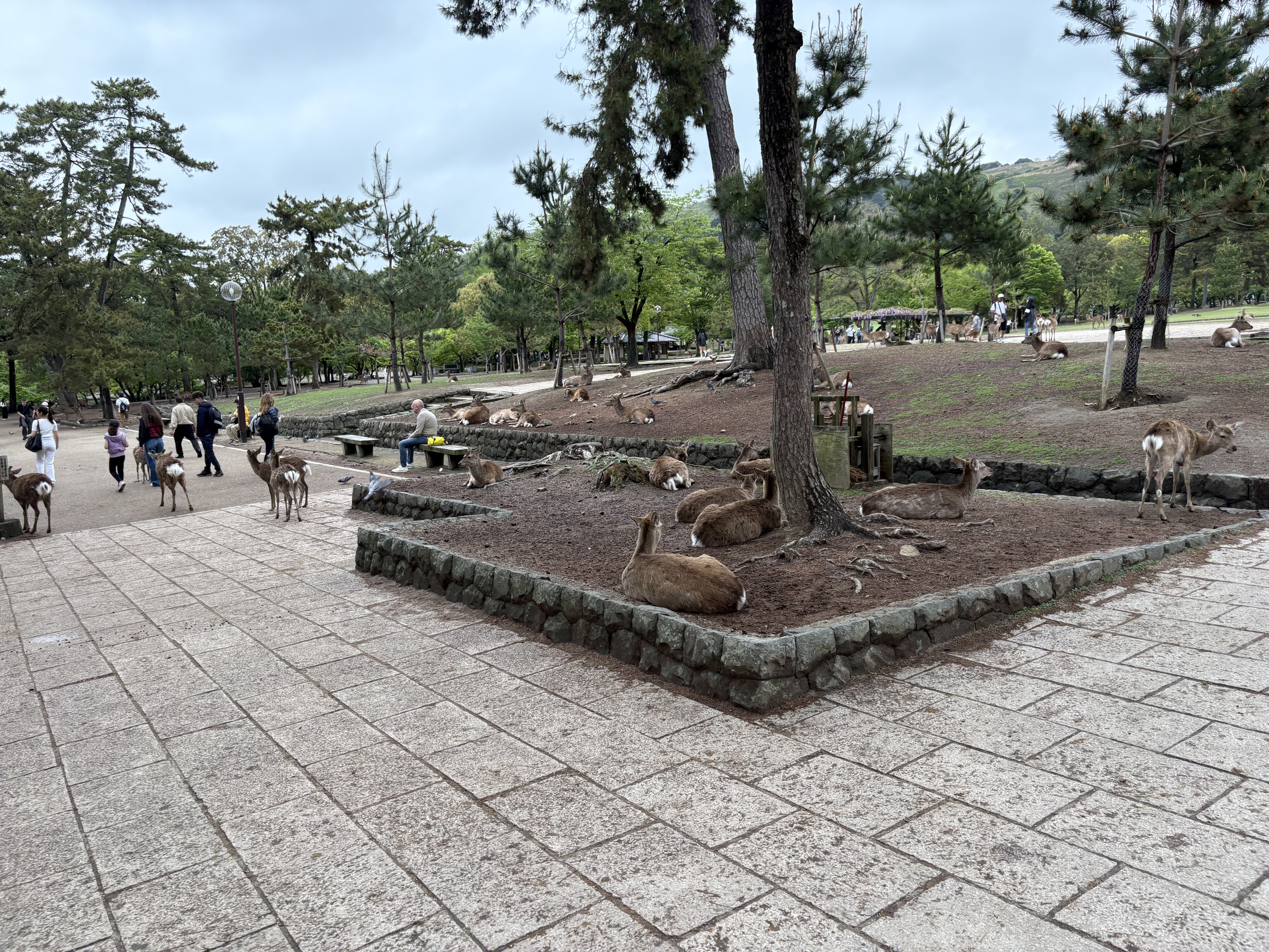 Leaving the temple, Nara deer were all over the place. They walk right up to people, since tourists have been feeding them “deer crackers” for generations, sold in stalls throughout the park. The deer are so comfortable around humans that there are warning signs posted to remind visitors to be cautious.