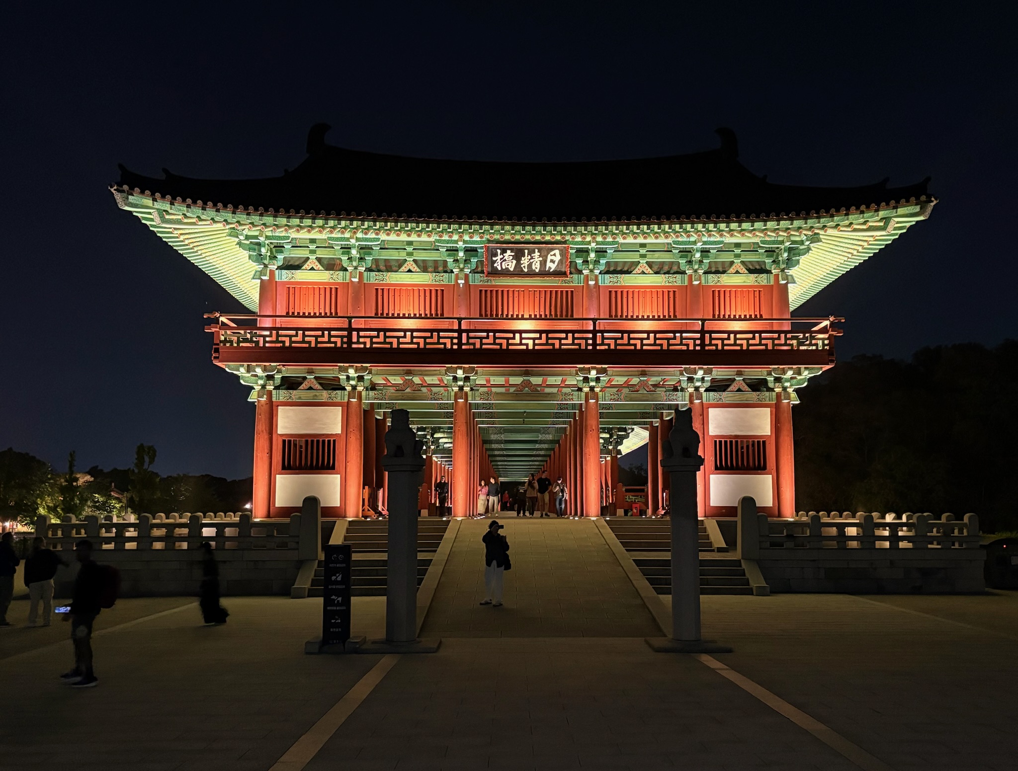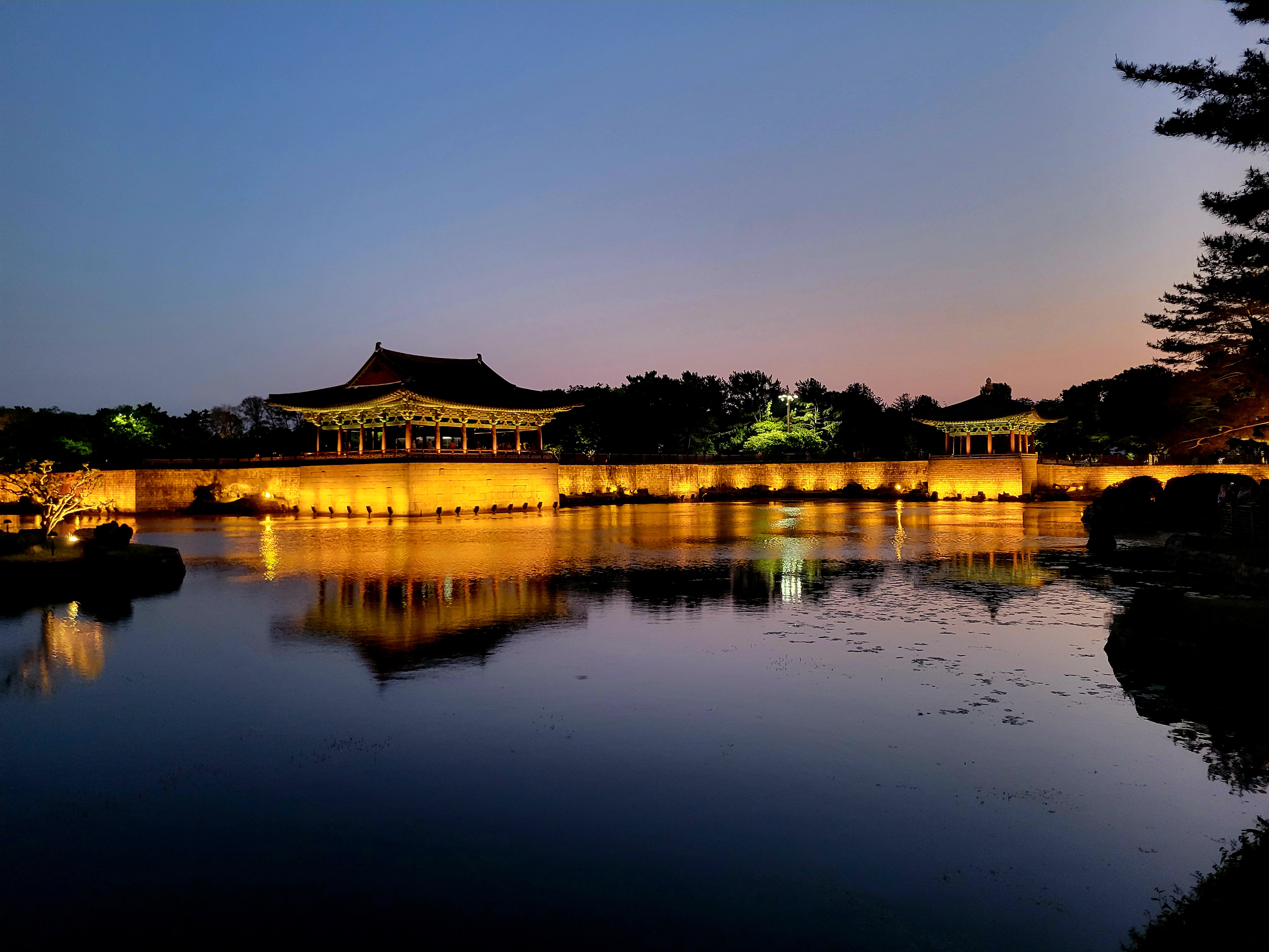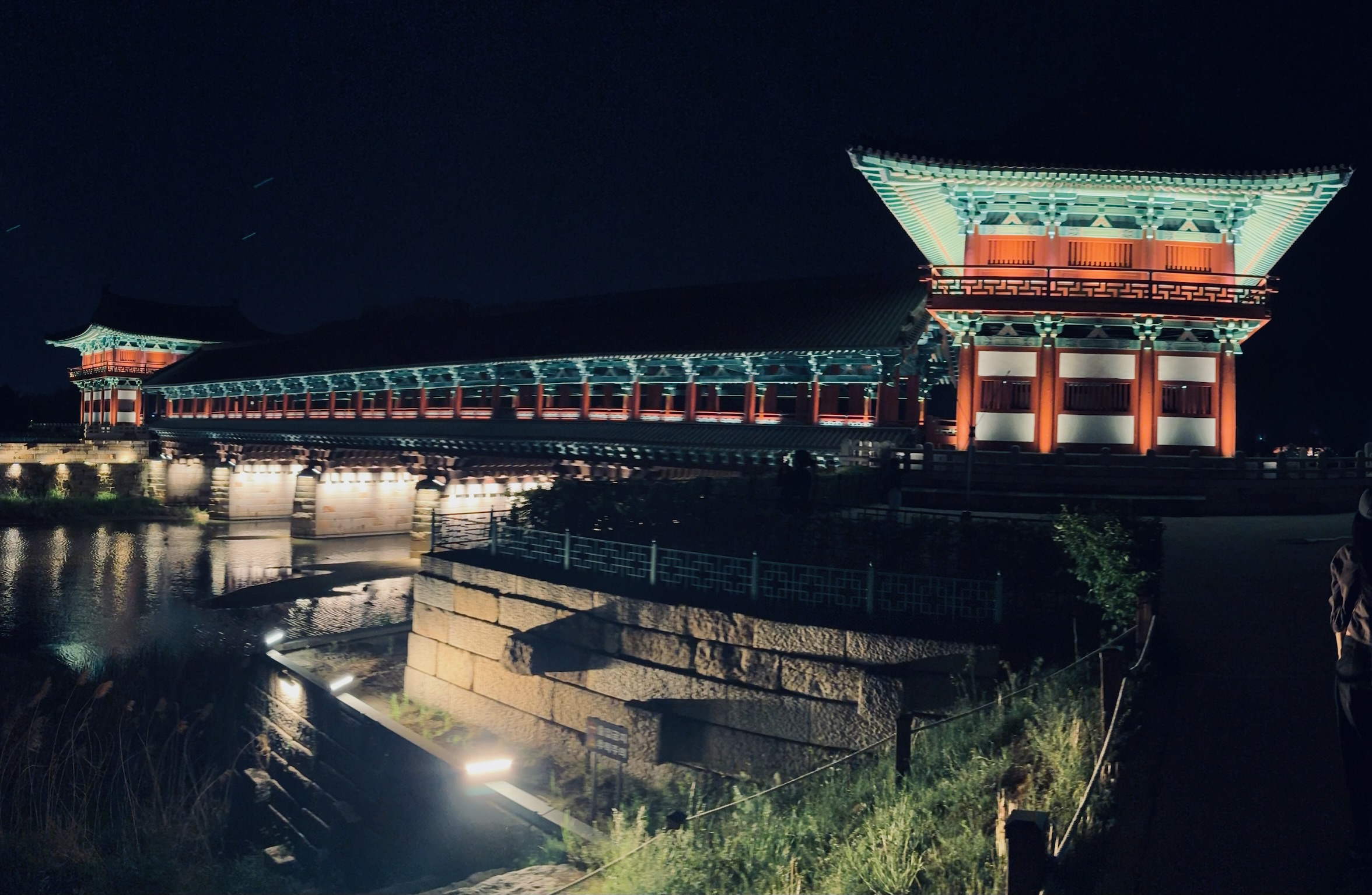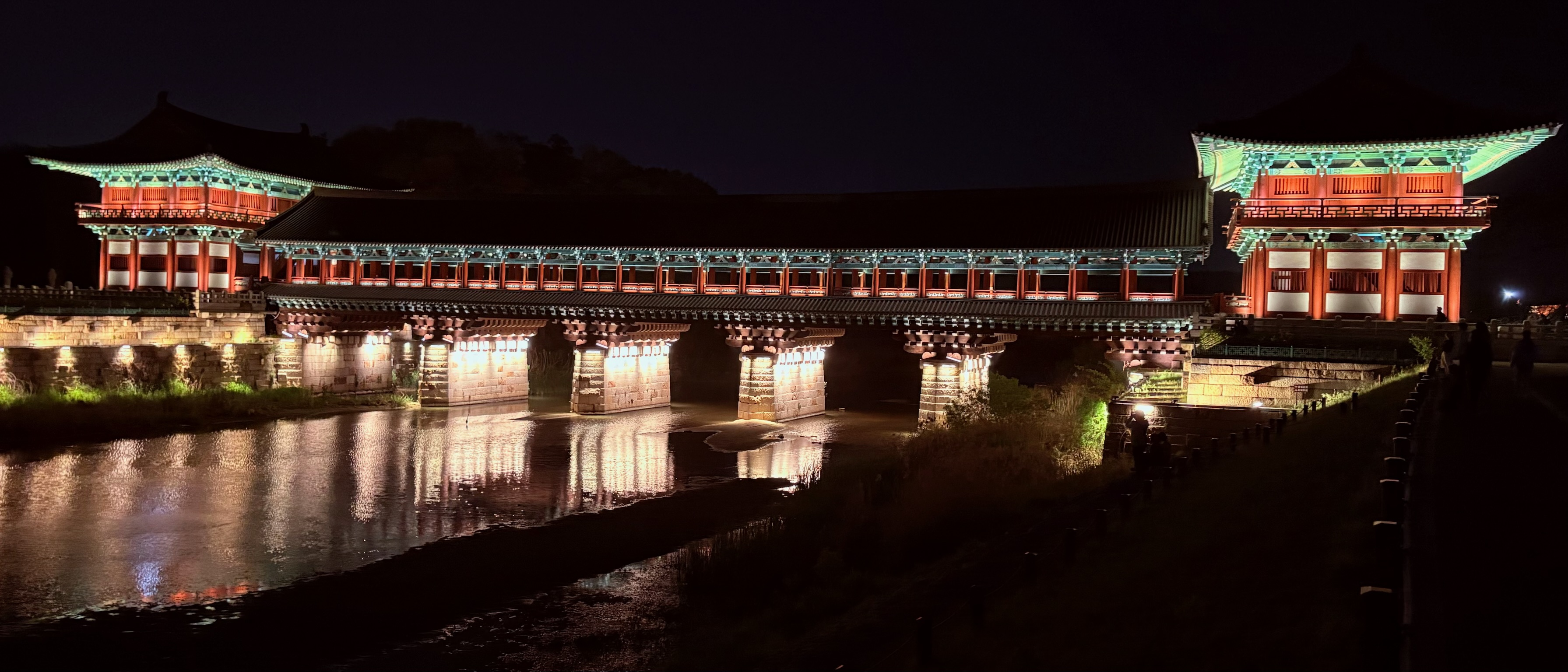 We were starting to flag at this point, but went to two more sites. One was a noble palace complex, Donggung Palace and an artificial pond called Wolji Pond built in 674. These buildings are reconstructions of the originals. “Wolji” means “pond that reflects the moon.” It did provide lovely reflections of the buildings especially as it got dark. The other site was the Woljeonggyo Bridge; this was another reconstruction, but very beautiful at night.