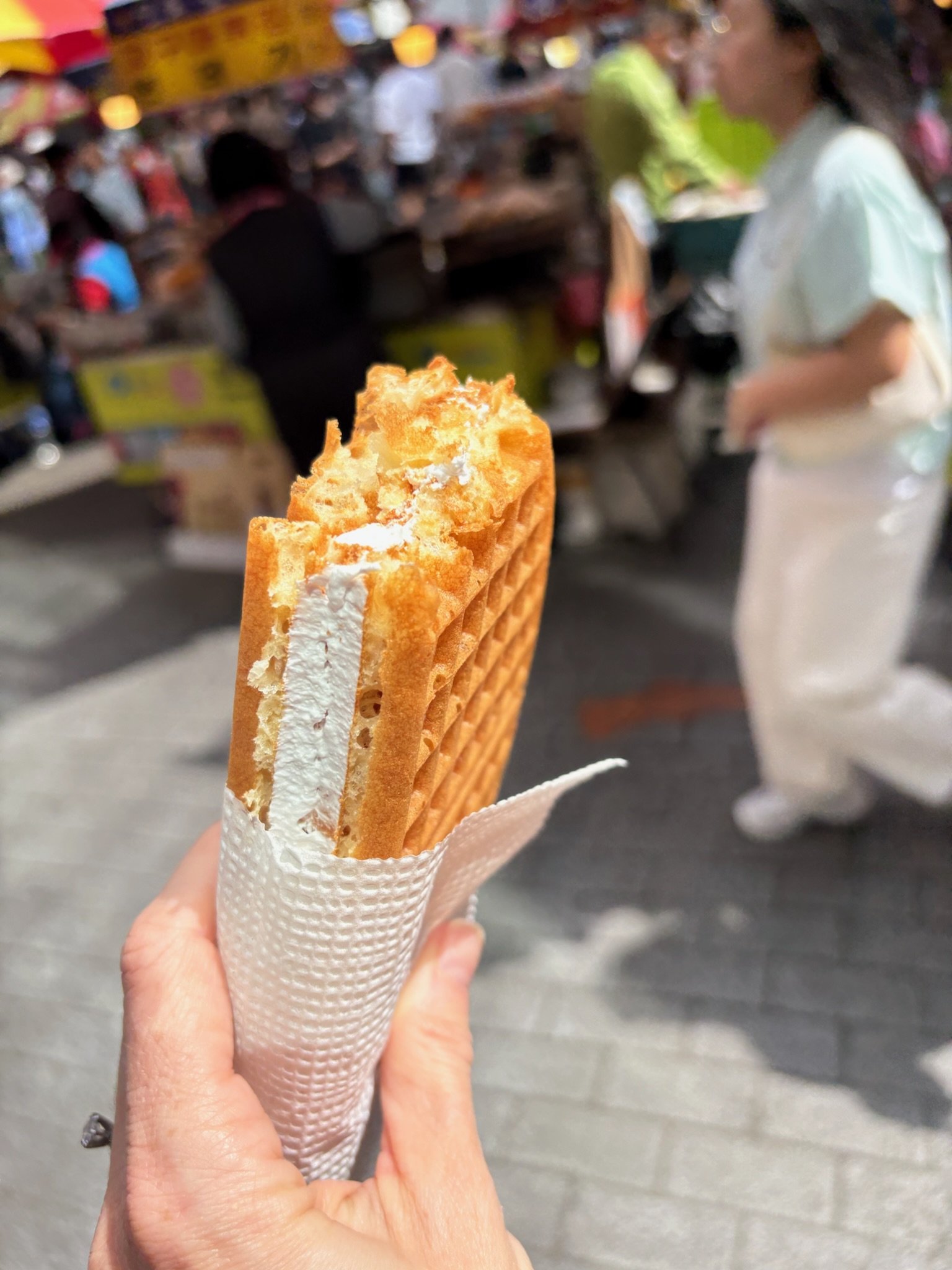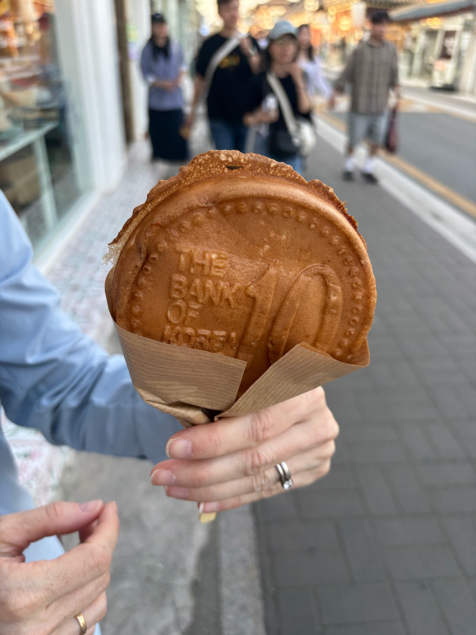 We spent a little time walking around the area, which was called Hwangnidan-gil, and got a traditional bread from a surly woman. It looks like the 10 won coins here and it tastes like a waffle with some really stretchy mozzerella inside. With all the cheese-stretching it was pretty fun to eat.