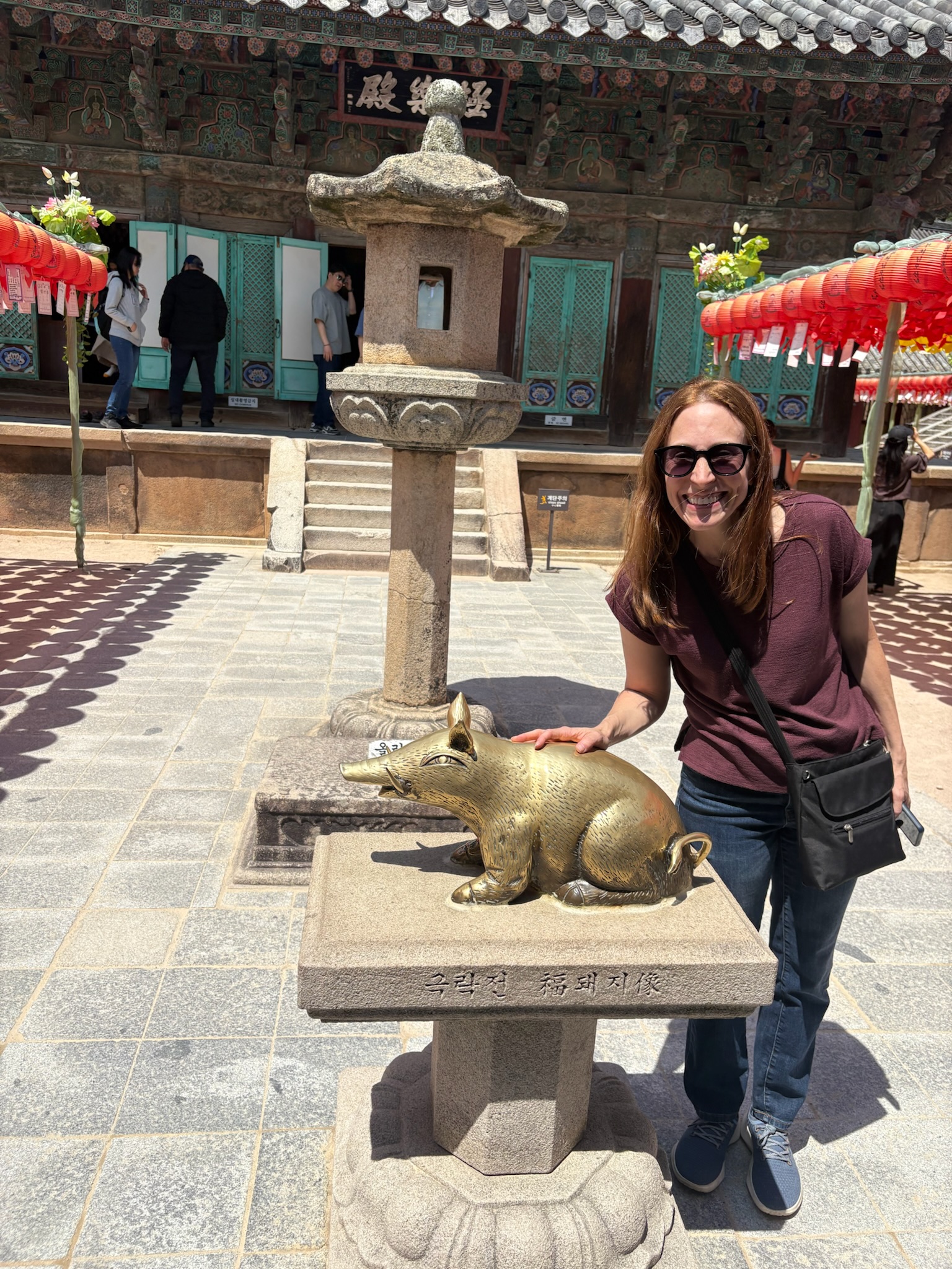 First we went to Bulguksa Temple, a Buddhist temple built during the Silla period in 751. The Buddha’s birthday is celebrated on May 5th (yes, cinco de Maio 🙂 ), so there were a lot of lanterns. If you look, you can see pieces of paper hanging from the lanterns–those are wishes! I have been honestly surprised by how much wishing and fortunes are tangled up in Buddhism. I don’t really let myself wish for things too often, I guess. You could also make a wish by buying a roof tile and writing it on that. When they need a new roof tile, they’ll incorporate your wish into the temple! Petting the warthog is supposed to bring good fortune. 🙂