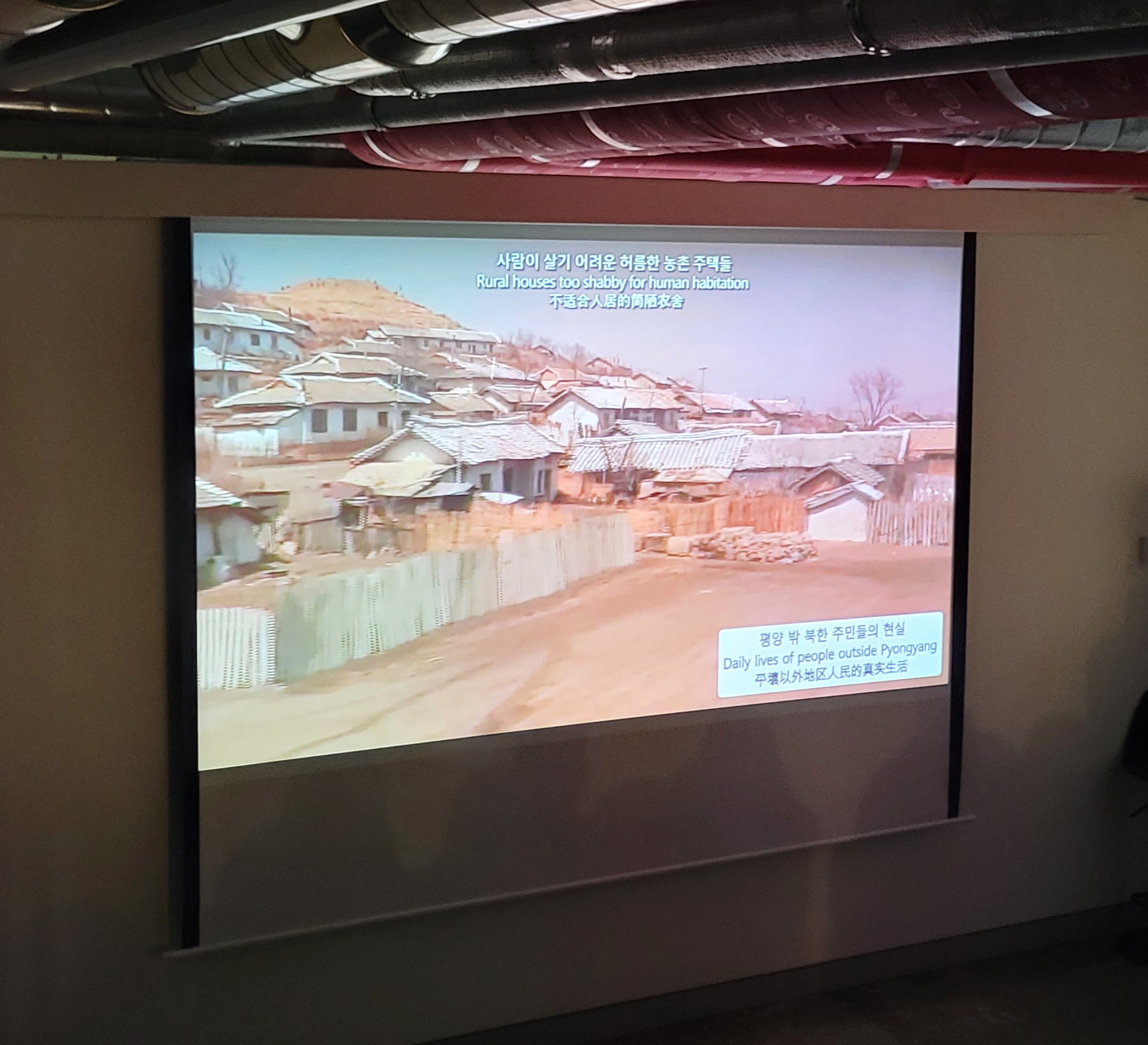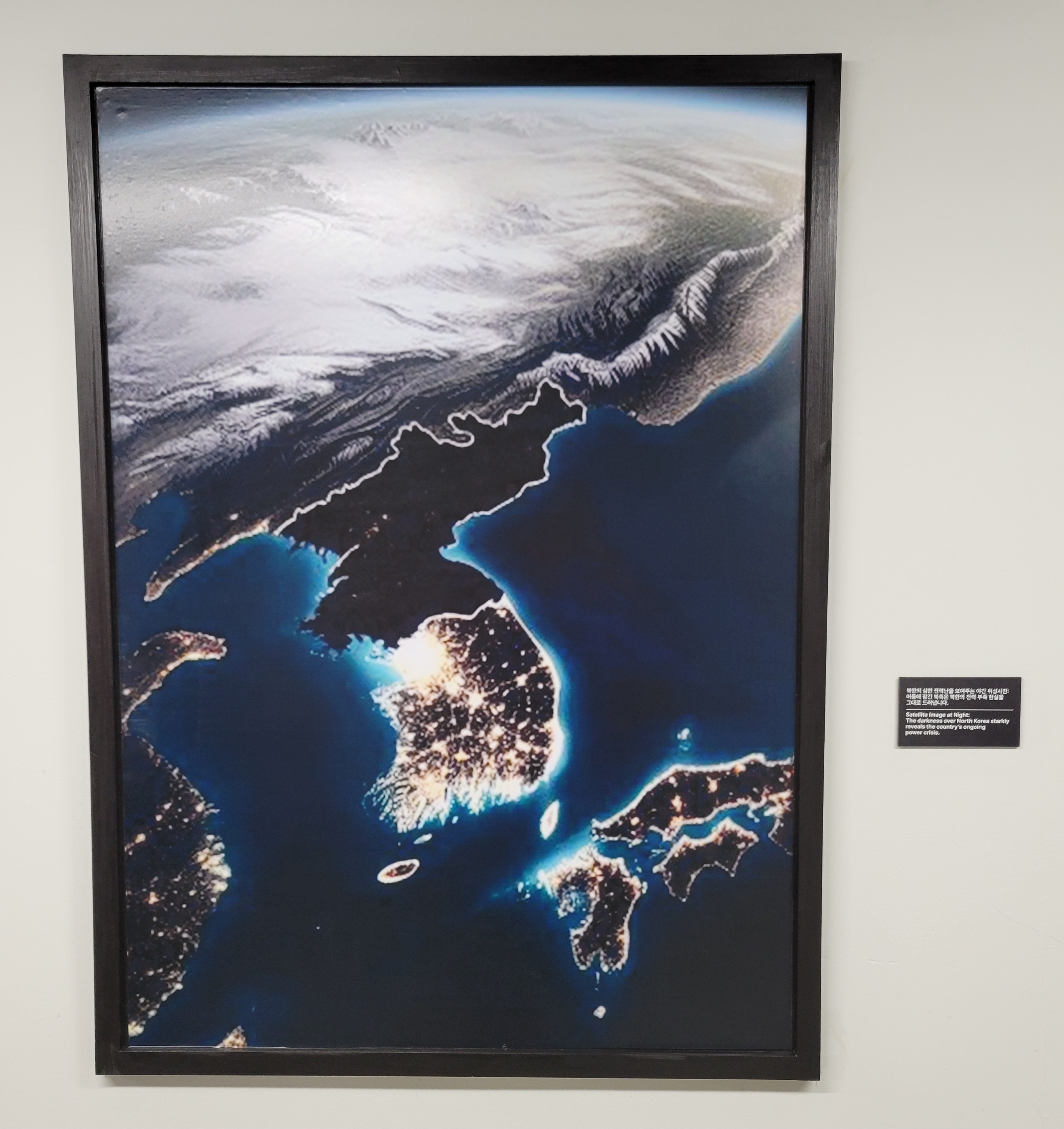 Here are some photos from inside a small DMZ museum we visited just before the interview. One satellite image starkly illustrated North Korea’s electricity crisis, most of the country is dark at night, even the capital, Pyongyang. North Korea experiences chronic power shortages, with rolling blackouts being the norm. In some areas, residents receive state-supplied electricity as little as once a year. Just before the interview began, we also watched a short video about daily life in North Korea.