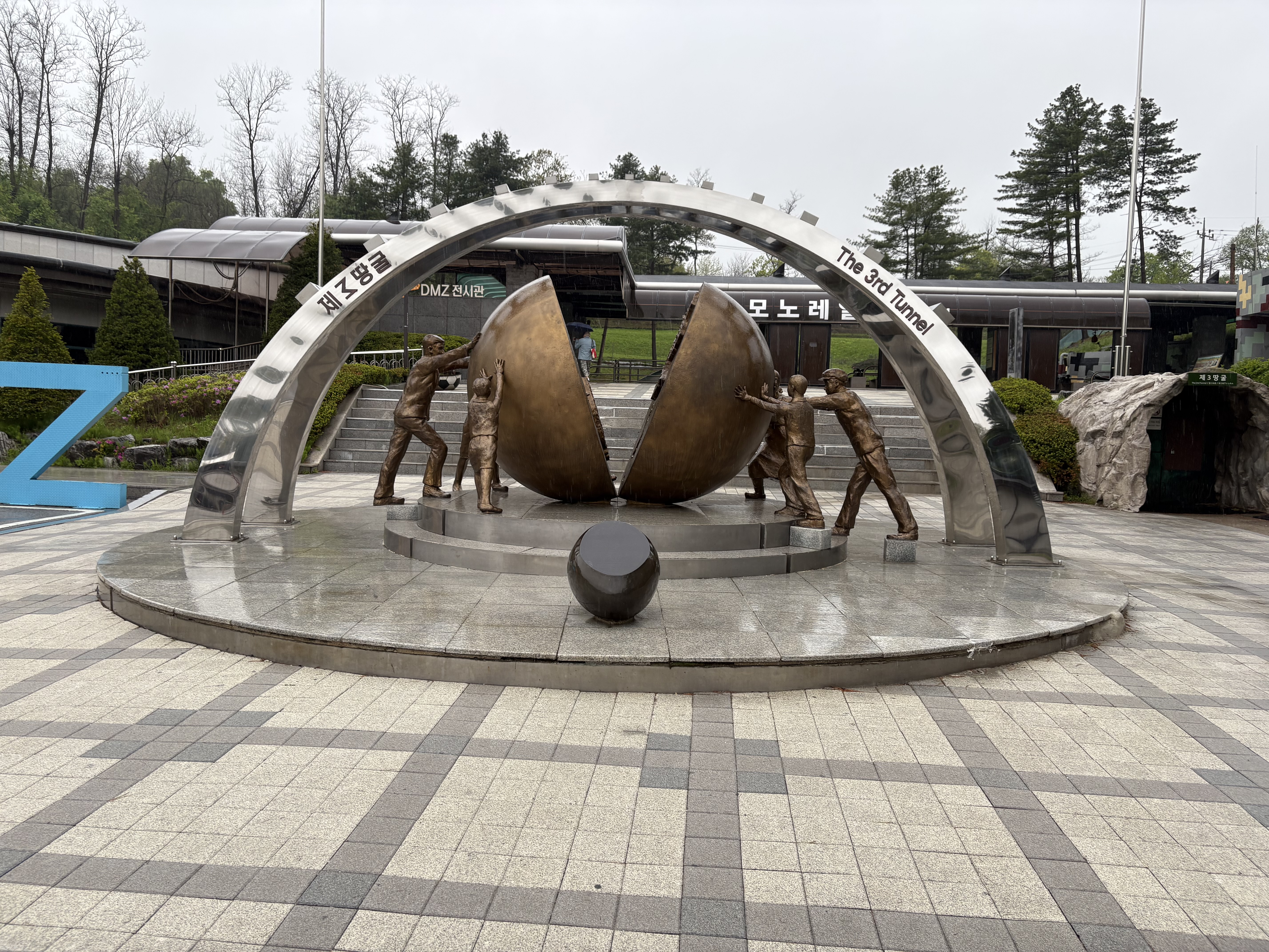 Our tour continued through the rain to the Third Tunnel. What is the “Third Tunnel,” you may ask? Sometime between 1953 and the 1990s, North Korea secretly attempted to infiltrate South Korea by digging tunnels beneath the DMZ. These tunnels were intended to be used for surprise attacks, but they were eventually discovered by the South Korean military, often after hearing underground explosions or noticing steam rising from the ground. Four tunnels have been discovered so far, though South Korea believes more may exist. Finding them is difficult, as the DMZ remains littered with landmines.