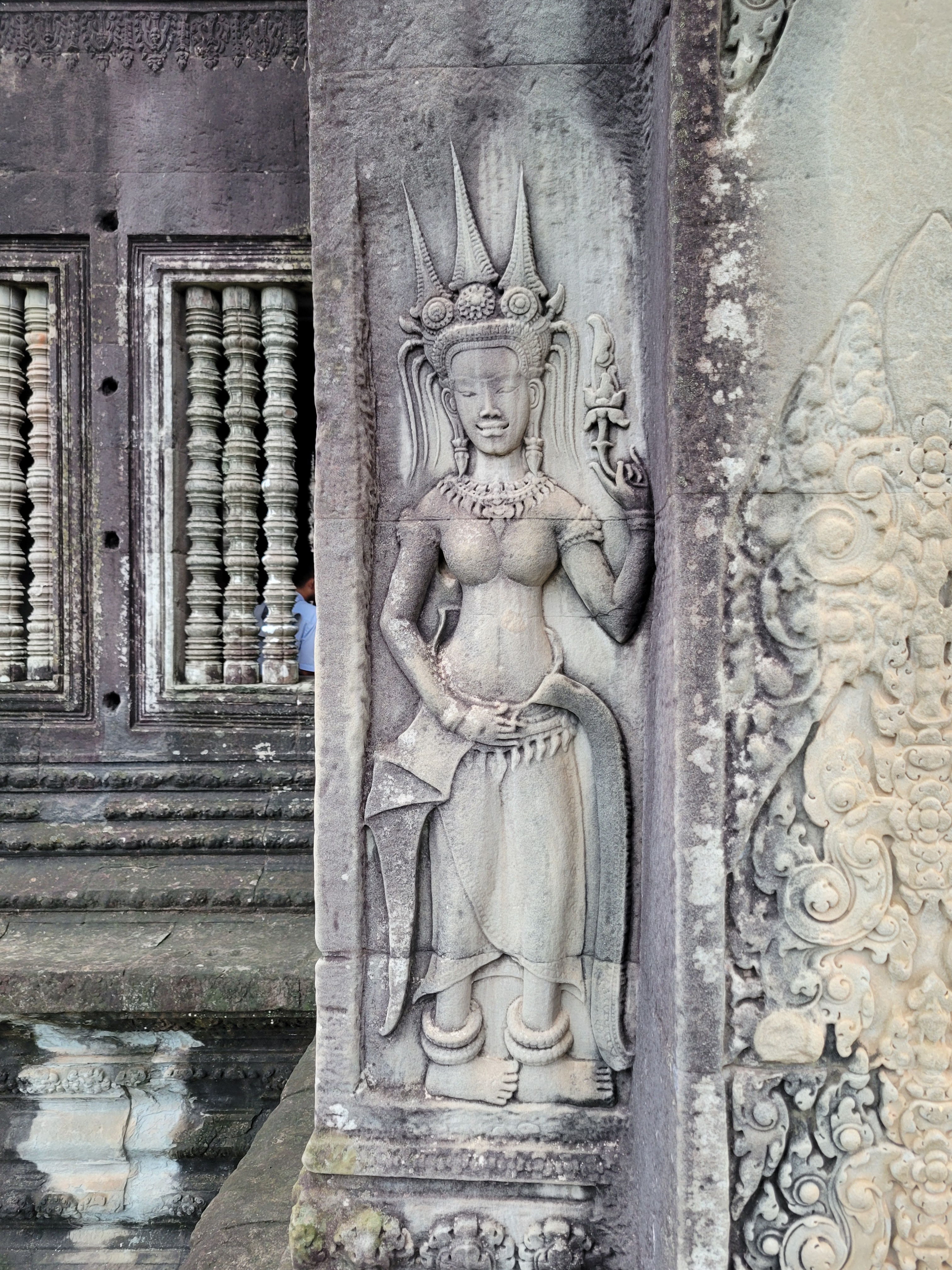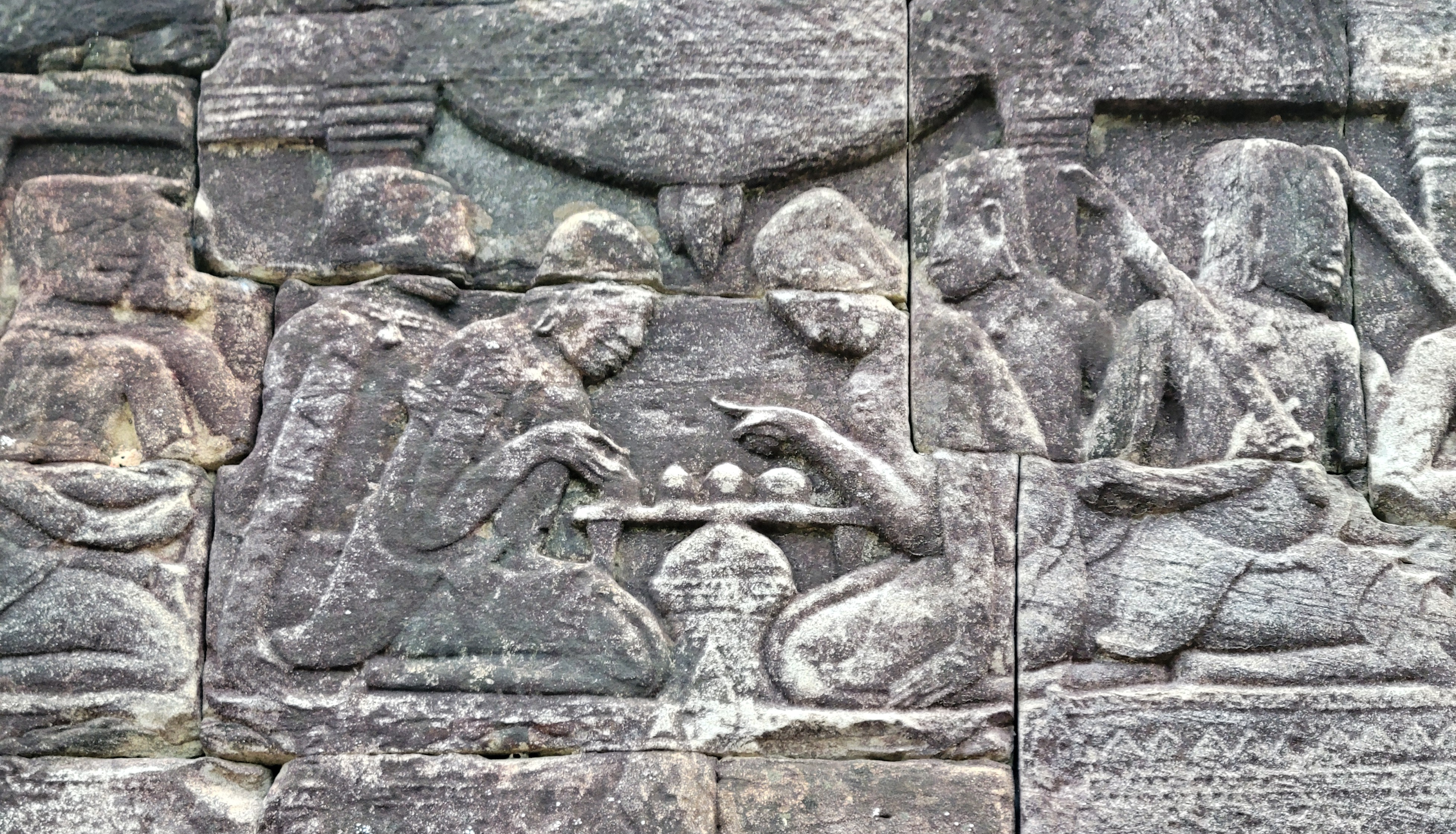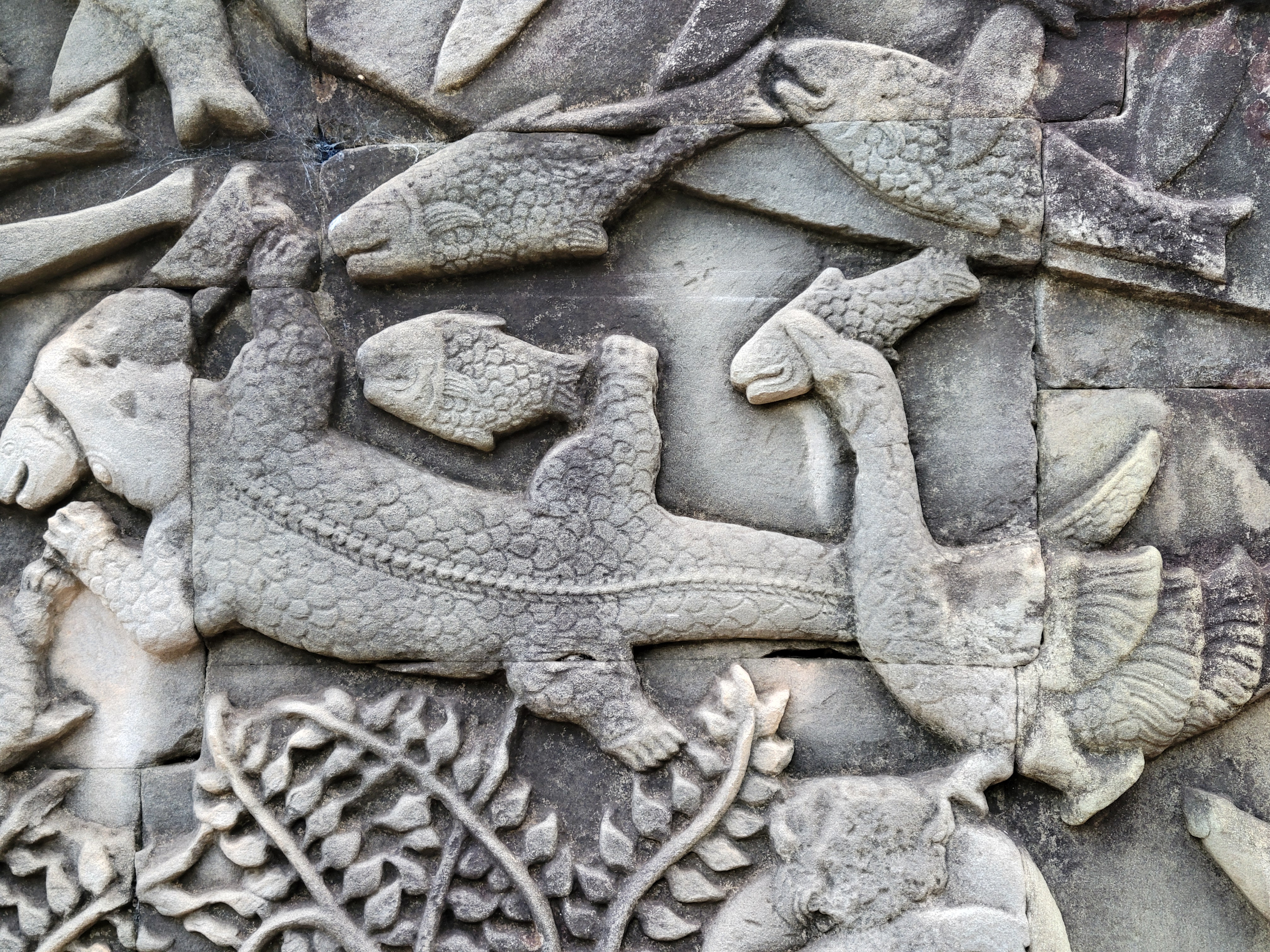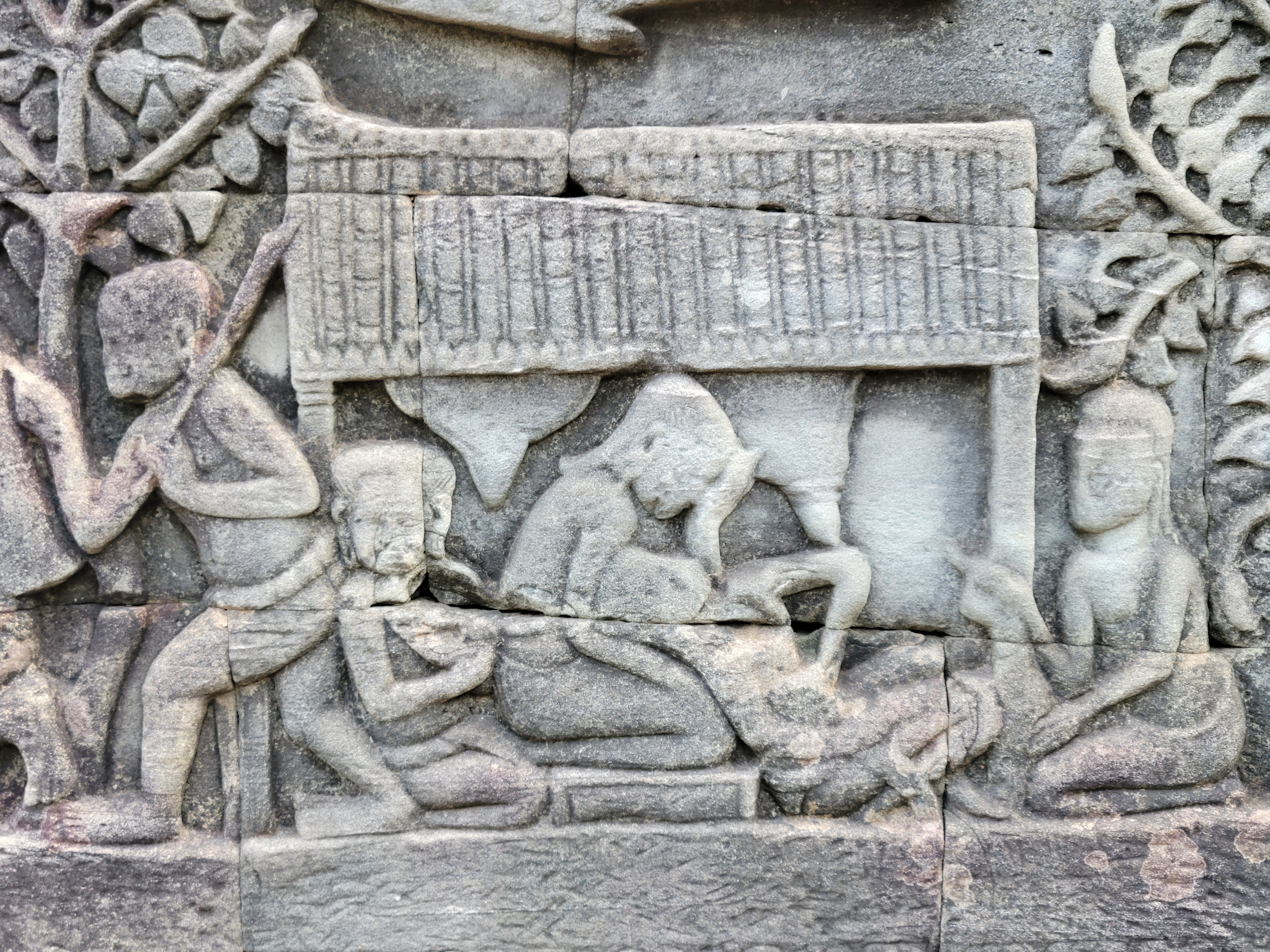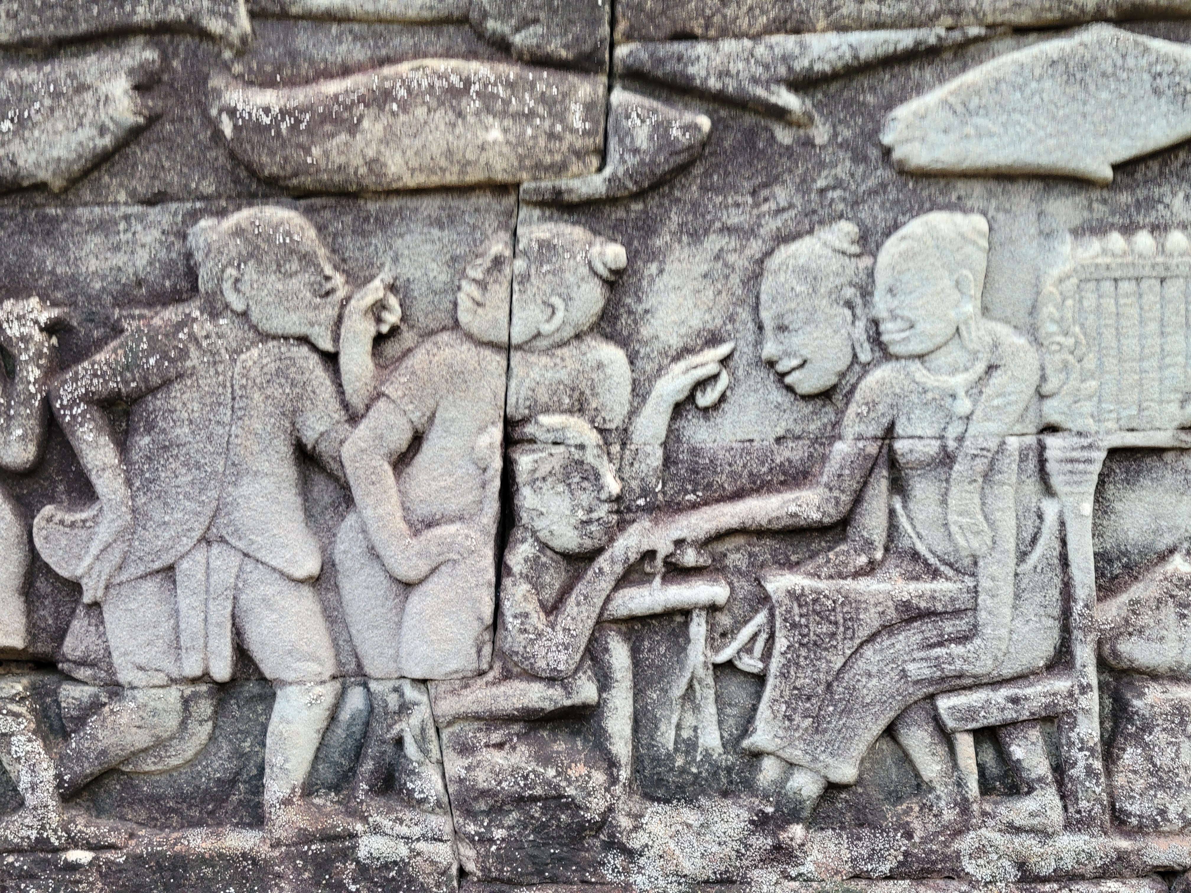 It also has scenes of 12th century Khmer (Cambodian) daily life on it. Below you can see someone giving birth surrounded by midwives, some market haggling, a board game sesh, and some fish getting caught by a crocodile and bird.
