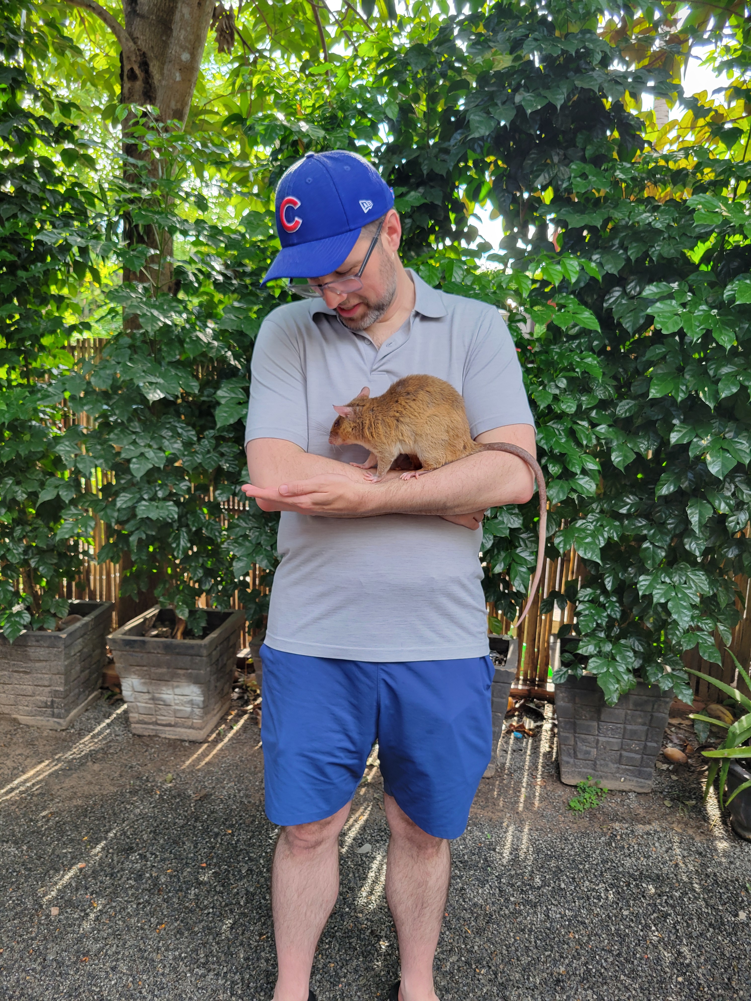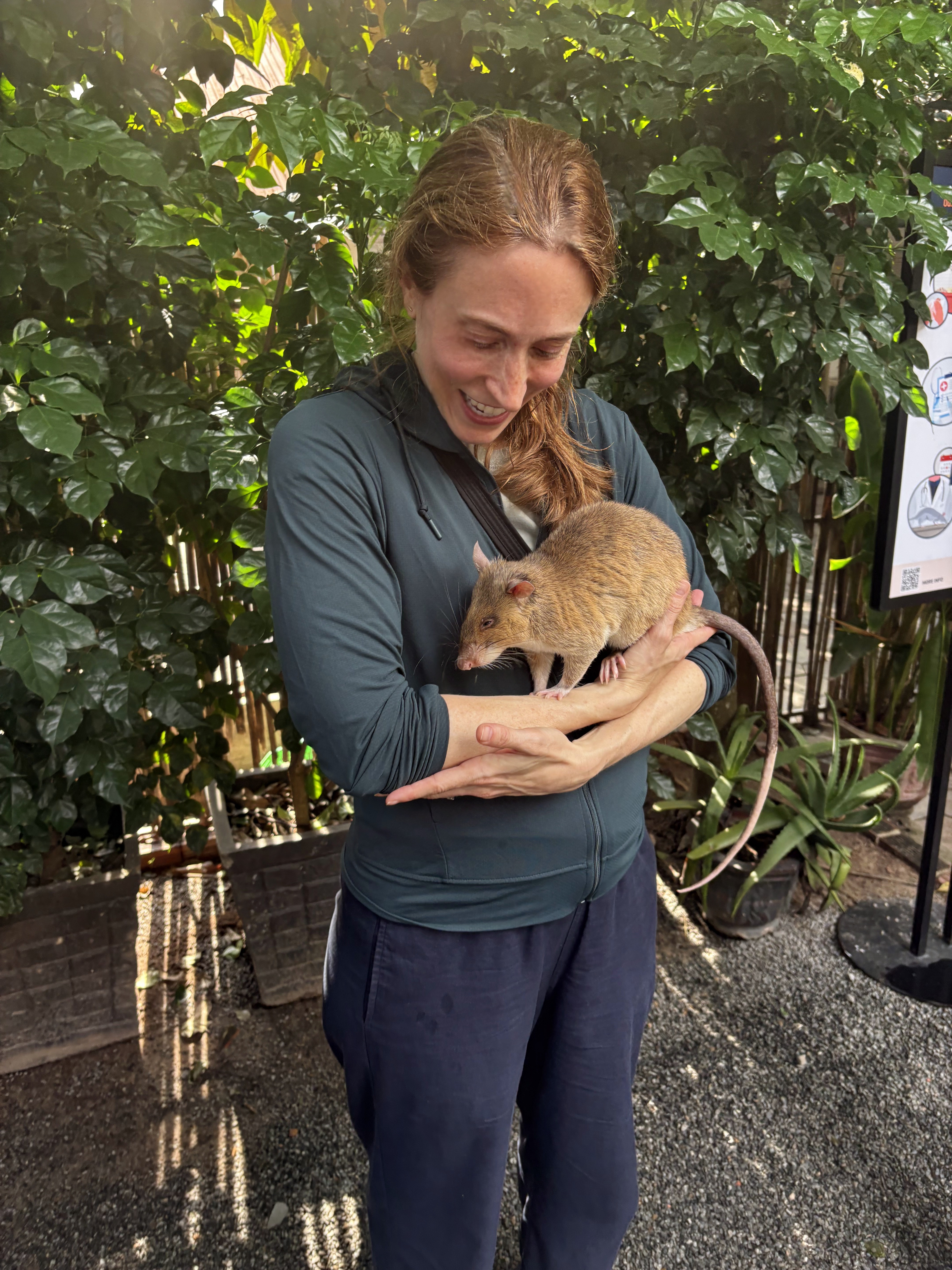 We had started our temple tours at 4:45 am so we were done by noon. We spent some time resting and then traveled to do a short tour of APOPO, a place where they train African giant pouched rats to find landmines. The rats are apparently very good at this and are light enough they don’t set off the mines. It was fascinating and we got to hold a rat whom I believe was named Glen. They are “pouched” because they can hold a lot of food in their cheek pouches–apparently two bananas can fit in them! The bananas we have seen here are a smaller, but that still seems like a lot of banana to me.