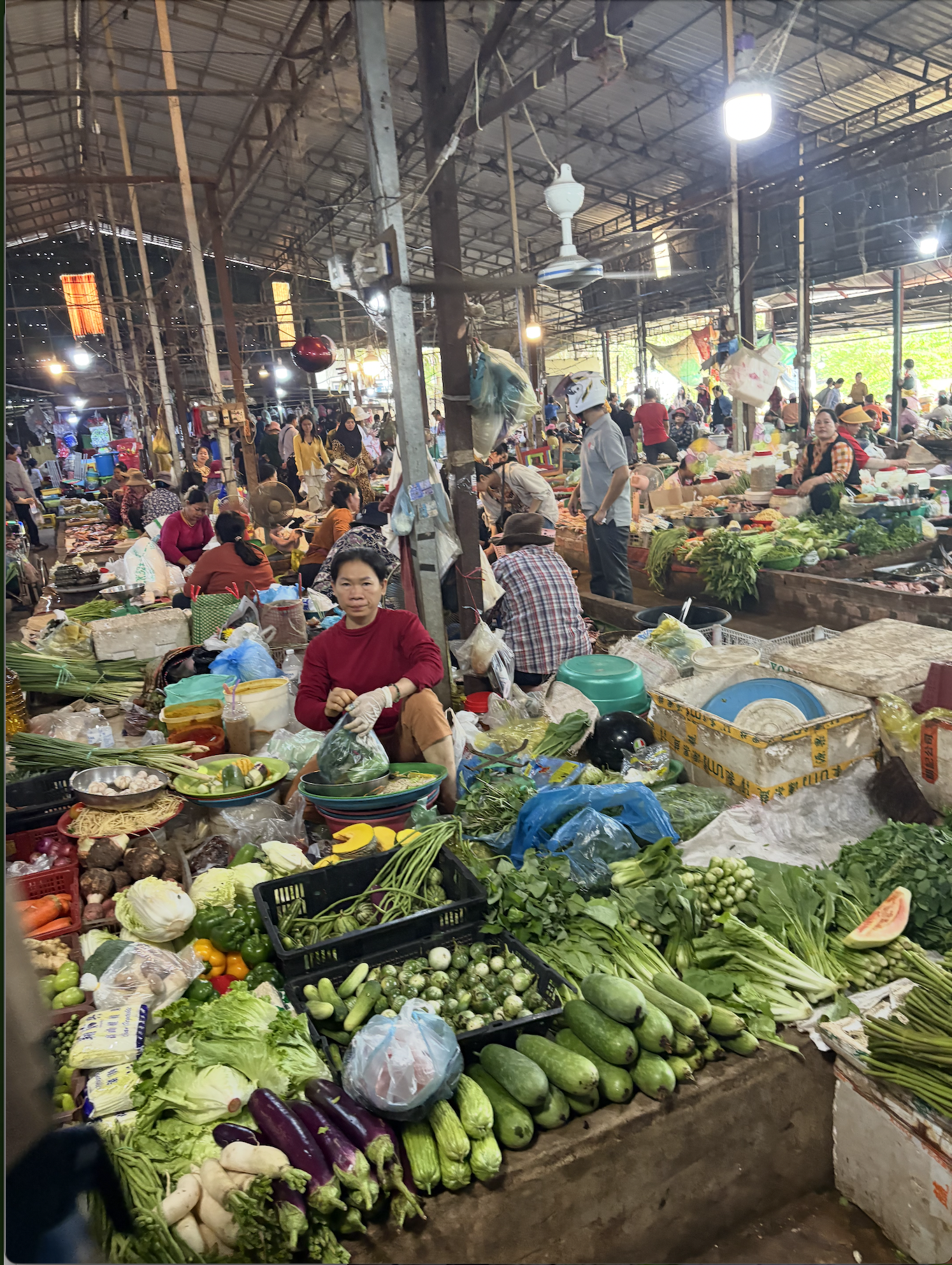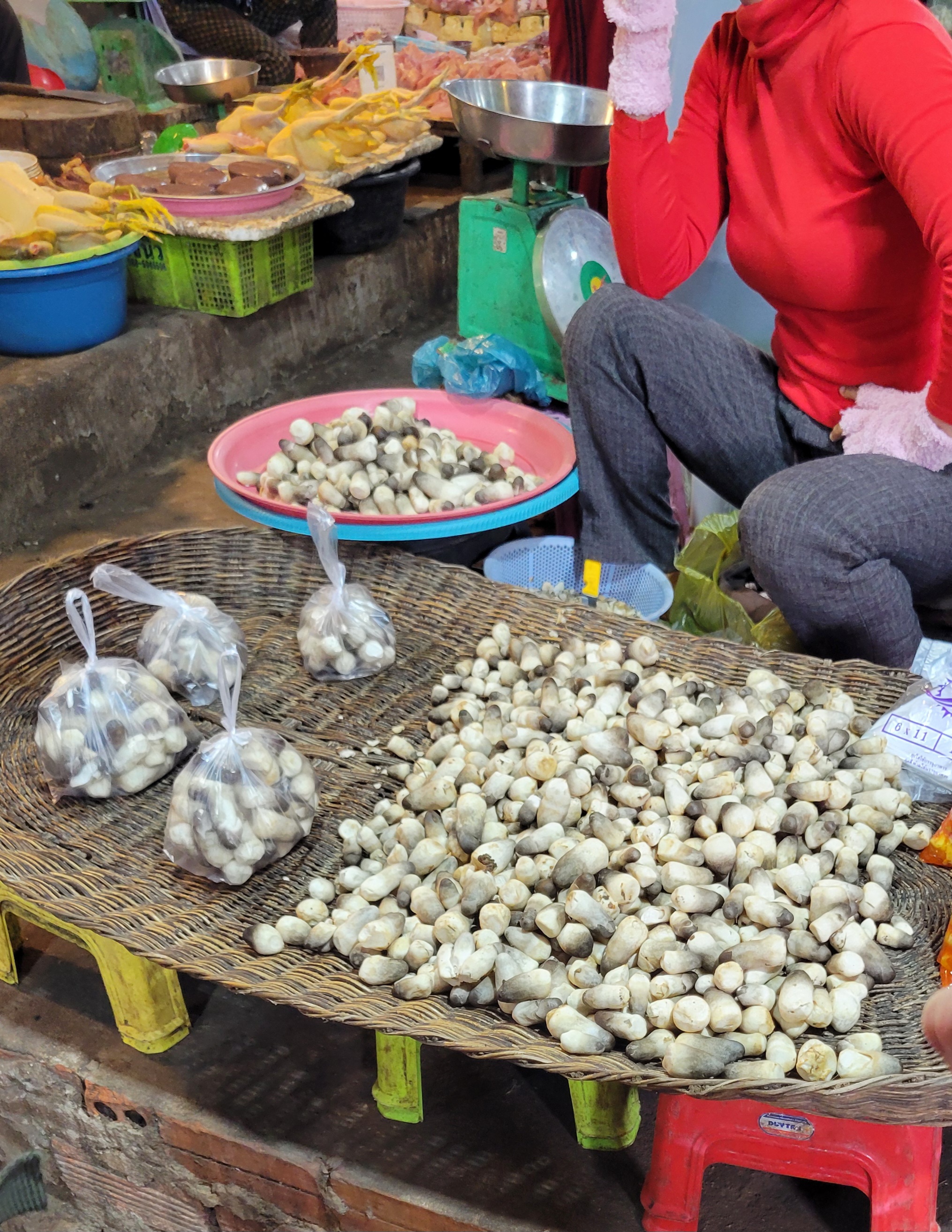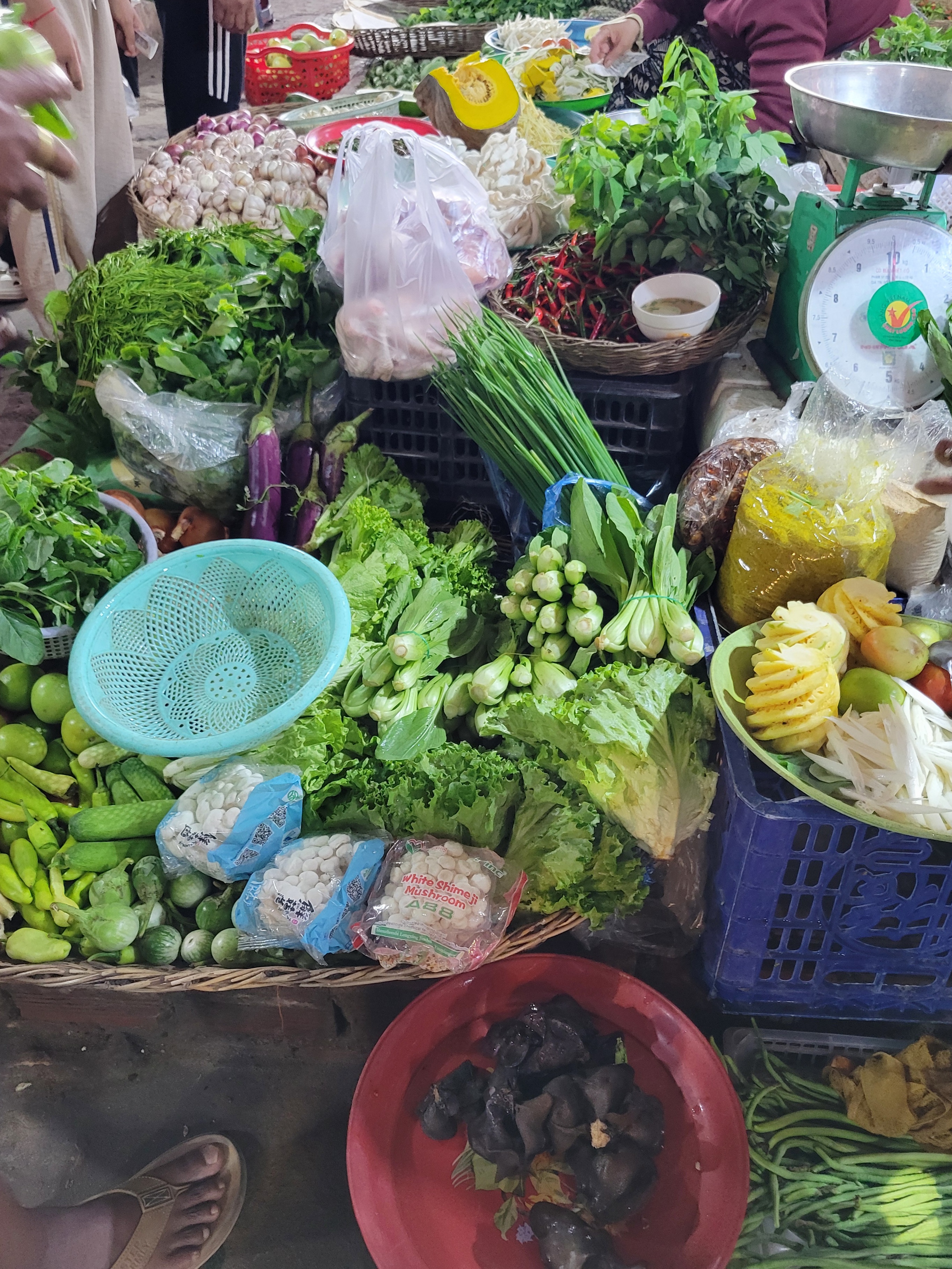 Beforehand we went to the local market. The market was a crazy contrast to the calm, air-conditioned grocery store that we went to the night before–it was loud, hot, and labyrinthine with many vendors and items. And no fixed prices, of course, which always makes us anxious and confused. There are a lot of fruits and vegetables that I have never seen in the markets here; I really love all the variety of mushrooms they have. The last picture is of some kind of mushroom.