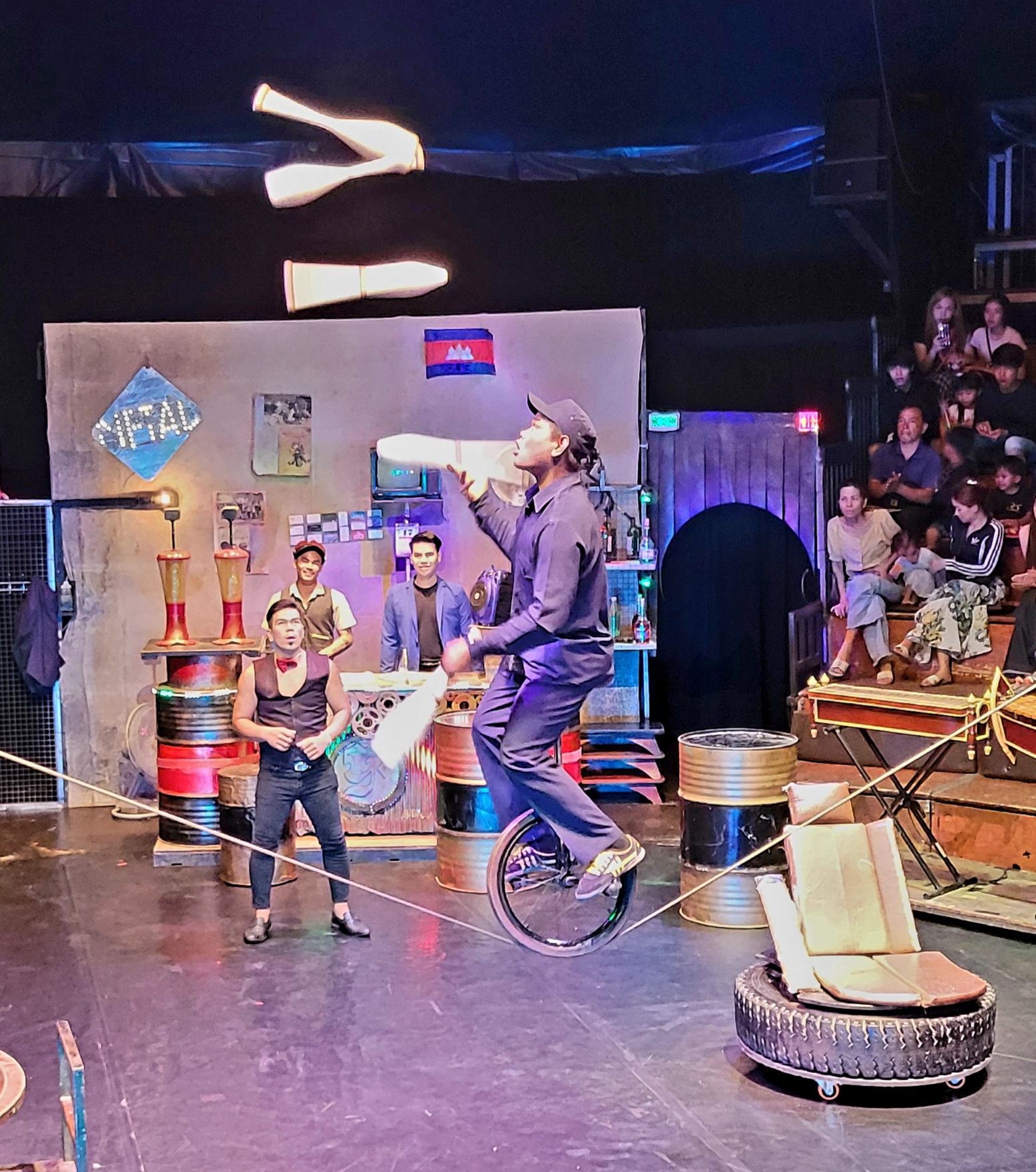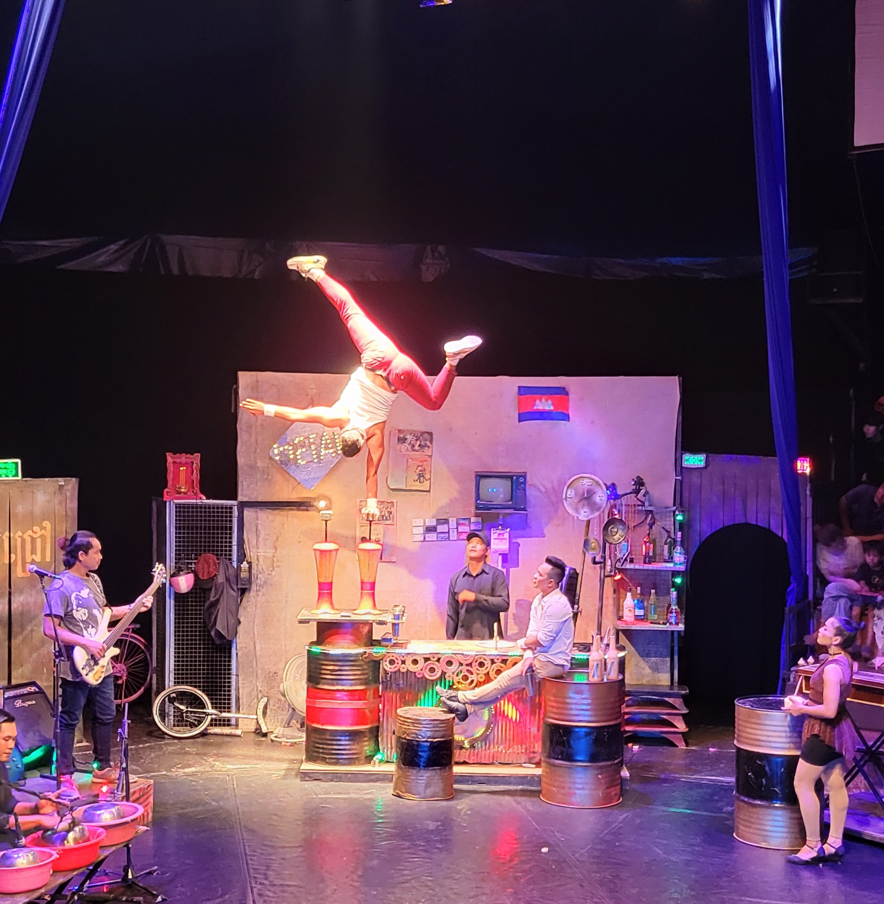 At night we went to Phare, the Cambodian Circus. Phare trains disadvantaged Cambodian youth in different art forms, including really fun circus skills. It was loud, chaotic, and delightful–the performers did amazing things! Somehow the performance was supposed to be showcasing the difficulties of being young in Cambodia, but I’m not sure whether that got across. It’s hard to have a joyful Circus performance with that sort of lesson, I think.