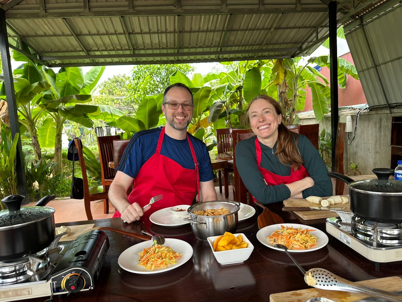 For our meal, we made mango salad–a new favorite of mine, I think I’ve eaten it everyday for the last three days–a tofu and mushroom fry-up, and a coconut cream banana dessert. The banana confection was heavenly–surprisingly it had mung beans in it!